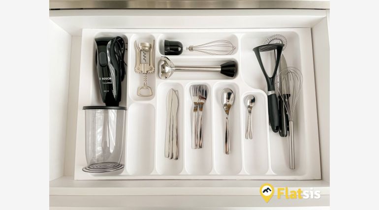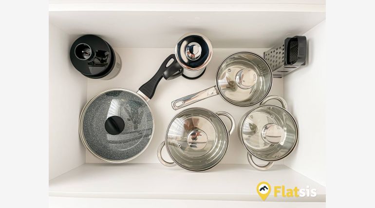 kitchen: stainless steel worktop and apron, refrigerator, microwave oven, electric kettle, toaster, blender, french press, pots, frying pan, cutlery and dishes, oatmeal, raisins, pasta, 2l bottle of water, green, black tea, coffee